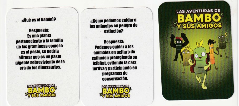 Las cartas es un juego de preguntas y respuestas sobre sobre temas relacionados con cultura ambiente y el bambú busca de una manera divertida crear conciencia del daño que se hace al deforestar y la importante de la cultura ambiental. Es el resultado del proyecto seleccionado Curso e-learning sobre Cultura Ambiental en espacios abiertos de aprendizaje y elaboración de material didáctico inclusivo en la convocatoria 2022 Innovación Educativa de la Dirección de Innovación en el Aprendizaje de la Ciencia y la Tecnología de la Secretaria Nacional de Ciencias, Tecnología e Innovación (SENACYT).
